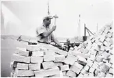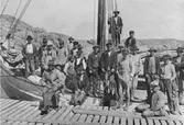 Enl. tidigare noteringar: "Fraktjakten "Ragnhild" lastar is i Hövik sommaren 1947. Personerna på bilden: Kristian Hövik, Jarl Hansson, Sven Niklasson. Repro 1985 av foto tillhörande Kjell Jacobsson, Uddevalla".