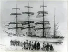 Fyrmastade barkskeppet Abraham Rydberg [III] vid möte med s/s Sierra Cordoba, OBS: Den mest hjul- och bredbente besättningsmannen är Björn Atterberg, sedermera kapten i Kungliga Flottan.