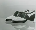 "Sommarskor. Sommarsportskor av vitt flätat skinn. Brun garnering. Låg klack". Snörning.