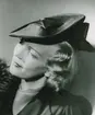 Porträtt av kvinna i buteljgrön velourhatt med brun garnering av Claude St Cyr, Paris.