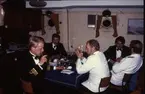 Bilden visar besättningen av en ubåt som äter julbord ombord i torpedrummet. Manskapet sitter runt ett fin dukat bord med levande ljus, bordsduk och servetter. Till höger och vänster syns de uppfällbara sängar. På översta bildkanten syns en talja med upphängd kedja för lyft av torpeder. Första mannen i höger rad framifrån är Evert Ingemansson.