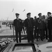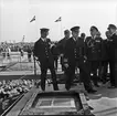 Den f.d. överbefälhavaren general Thörnell hälsas välkommen ombord på Fylgia. I bakgrunden syns jagarna Norrköping och Stockholm till ankars.
