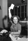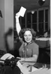 Modebilder 23 april 1966 En mannekäng klädd i kritstrecksrandig dräkt med kort kjol och svarta pumps håller vänstra handen utsträckt i en gest. På väggen syns en liten bit av en tavla som hänger där.