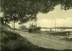 Tryckt text på kortet: "Grebbestad. Campingplats med havet i bakgrunden.."