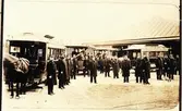 "Mönstring av hästspårvagnar och personal framför hallarna." tidigt 1900-tal.