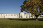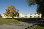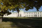 Bilden visar en gårdsbyggnad på hösten. Höstlöv har börjat faller ner från de stora träden som står framför huset.