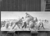 Heljesgården, Bolum. Iordningställande av halmstack. Fläkt blåser upp halm till stacken.