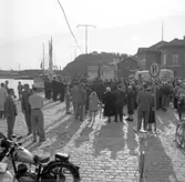 Enligt noteringar: 70 st. ramade dia. + 5 st. burkar med oramade dia. Båtar, Varv, Hav. Film nr. 128 Hamnen, GG 132 "Nomy" (skeppare Hans Utbult ej med på bilden) Den lilla vita boden framför stammen på båten är hamnkontor.