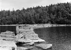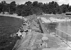 Foto av Ingrid Welander (f. Lagerholm) samt kvinnor och män sittandes på en pir. Bildtext i album: "På Gränna hamnpir 1916".