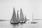 Från vänster till höger 10-S2 WISH, XV-S2 HAVSÖRNEN (skymd), jakt utan segelnummer, 15-S15 O P, jakt utan segelnummer, XV-S10 ESS II, XV-S5 NINETTE och oidentifierad jakt.