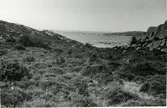 "Havsvy från Boethius område mot Sandö och Ginglaholmen." Sänka mellan bergen bevuxen med bl a ljung och enar.
