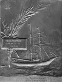 "Gefle Seglelsällskaps Hederspris". Bojan från Bo Fajans, formgivare Eva Jancke-Björk, 1900-talets mitt. Dekorerad med en stor illustartion av en tremastad fullriggare med bland annat åtta råsegel. Locket är dekorerat av en skulpterad och målad fisk.