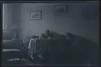 "Fridas syster Anna, Greta Pettersson, Elsa Vall /A-LE" Tre kvinnor i en kökssoffa med rutig tygklädsel. En kvinna ligger mellan de båda andra.