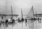 Germaniaviken, Djursholm. Isjakter hissar segel på isen.