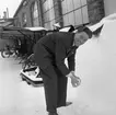 "Thorson" kramar en snöboll, Monarks cykelaffär, Uddevalla den 15 februari 1956