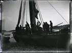 Fotografi ur Detlow von Brauns album. Segelbåtar och sällskap i naturhamn.