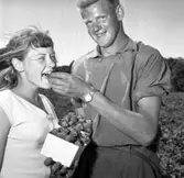 Jorgubbsförsäljning på Gävleutställningen 1946 på Travbanan med anledning av Gävle stads 500-årsjubileum
