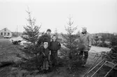 "Mikael, Marie och Ralf Helén väljer bland Erland Ramsbos granar." Gården Rantorp i Lindome, år 1984. För mer information om bilden se under tilläggsinformation.
