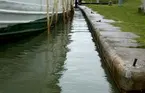 Bilden visar minfartyget Älvsnabben från babordssida framifrån som ligger förtöjt i hamnen. I förgrunden står en ensam marinsoldat på kajen.