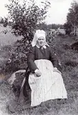 "En Göingemora i sin prydno klädd i `Klut" och förklä". Skåne, Östra Göinge härad, Orsby socken.
