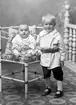 Ateljéfoto av syskonen Greta och Håkan Pehrson, barn till handelsman Oscar Pehrson i Varberg. De står vid ett runt bord med textil beklädnad. Håkan bär en kolt med brodyr på skärp och krage.