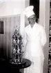 Konditor Arne Lind visar upp sitt gesällprov, Hantverksföreningens festvåning, Nedre Slottsgatan, Uppsala mars 1943