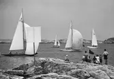 Medföljande text: "Myrens Mekaniska Verkstad, Strömstad. På bilden syns Långedragsjullar byggda vid verkstaden. Till höger i bilden snickarverkstaden. Bilden tagen 1945-52. Originalfoto tillhörande Allan och Erik Ljungqvist, Strömstad".