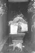 Begravning, likkista och begravningskransar. Kyrkointeriör.