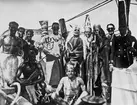 Bilden föreställer en grupp män utklädda till kung Neptun och hans hov under ceremonierna kring ett linjedop ombord på minfartyget Älvsnabben i samband med långresan 1966-1967.