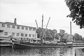 Hardangersnipa vid västra hamnarmen. I bakgrunden en däcksbåt, ombyggd till lustbåt samt en blekingseka. Skåne, Malmöhus län, Viken.