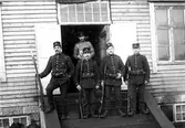 Brovaktare framför förläggningen i gamla byggningen på Ol-Ers. Foto 1914-1918. Nummer två i främre raden var kock, nummer tre hette Lundeberg, son till disponent Lundeberg i Mackmyra.