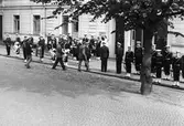Bilden visar en grupp militärmusiker som har tagit uppställning på Drottninggatan i Karlskrona.