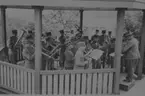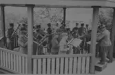 Storgatan i korsningen mot Kungsgatan. En militärorkester tågar fram. Till vänster syns bl a elmontör Wilbert Lönnblad.