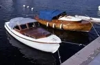 Trämotorbåt med utombordare och en tvåmans paddelkanot.