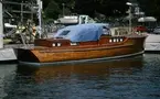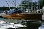 "Svenska Kryssarklubbens fest 1960", troligen i Norrviken på Runmarö. Motorbåtar vid hamnbrygga. I förgrunden två män och en tax med boll i munnen.