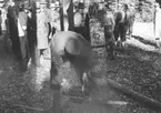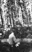 Skogsbruk, trädfällning, en man med motorsåg. Gustafsson & Gortz (beställare ?).
