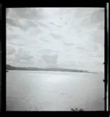 Bilden föreställer ett landskap med vatten och ett trädbeklätt berg. Bilden är tagen under minfartyget Älvsnabbens långresa 1966-1967.