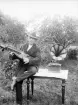 Folkdans och spelmansstämma i Örebro 16-19 juli 1965 i samband med Örebros 700 årsjubileum. Riksspelman Erik Salström med nyckelharpa i Stadsparken.
