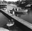 "Svenska Kryssarklubbens fest 1960", troligen i Norrviken på Runmarö. Motorbåtar vid hamnbrygga. I förgrunden två män och en tax med boll i munnen.