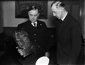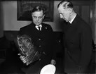 "Byråsekreterare Ivar Widegren överlämnar plaketten över Nathan Söderblom till förste kurator Hampus Lyttkens" vid Uplands nations jubileumsfirande, S:T larsgatan 11