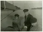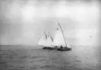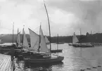 Från KSSS volontärkappsegling på Bogesundsbanan 20 augusti 1916. Närmast med segelnummer 8 plymsnäckan IVERNA. På avstånd längst t h med segelnummer 11 ses 16 kvm snäckan KAMRATEN. IVERNAs och KAMRATENs identitet framgår av andra fotografier från seglingen i KSSS årsbok 1917 s 172 f. Båten närmast efter IVERNA har inte kunnat identifieras.