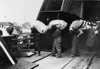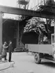 Chauffören, postiljon 11, Einar Andersson (t.v.)lämnar postpaket på Tullkammaren, där 1:e tulluppsyningsman Ernst Hofvensten prickar in. Paketen från utlandet kan adressaterna hämta på Tullkammaren direkt utan att först ha varit på postkontoret.