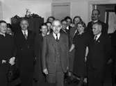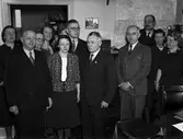 Postmästare Wilhelm Petrelius uppvaktas av personalen när han går i pension, Postverket, Kungsängsgatan 19