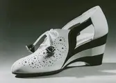 "Sommaskor, proenadsko". En sko med perforerad dekor, snörning, tvåfärgad kilklack.