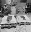 Två skrattande flygmekaniker i overall sitter på vingen till ett propellerplan.