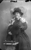 Kvinna med hembygdsdräkt står på gårdsplan utanför Engeltofta, Norrlandet med en pudel vid sin sida.