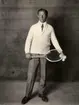 "Nordiska Kompaniets tennisvecka". Tennisspelaren Josef Kozeluk iklädd kofta, långbyxor, skjorta och slips, med racket och bollar.