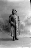 Modell klädd i regnkappa med skärp, pumps och klockhatt.
