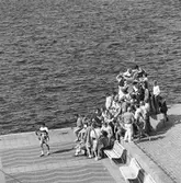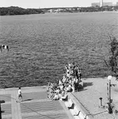 Stadshusträdgården. Stockholmare har i vårvärmen sökt sig till stadens vatten och slagit sig ner vid Stadshuset. Vy mot Riddarholmen. Skulpturen till vänster är Carl Eldhs "Sången".