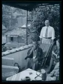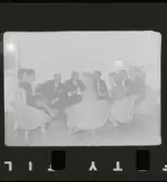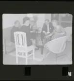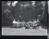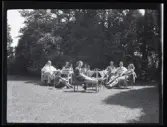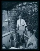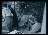 Ett sällskap sitter ute på en balkong och tittar på fotografier tillsammans.